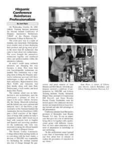 Hispanic Conference Reinforces Professionalism By Juan Reyes On Wednesday, October 26, 2005 Liberty Training Institute presented the Second Annual Conference of Hispanic Automotive Technicians ‘CHAT’ at the Passaic County Community College in Paterson, NJ. The event gave way to a night of learning and enjoyment. Participating local vendors were at hand displaying their products and giving away prizes to the more than 60 technicians that came to learn about new technologies. The event brought the automotive technicians together and reinforced ethics and professionalism within the automotive industry. In today’s world many technical advances are changing the way business is done. Now more than ever knowledgeable technicians are needed. This conference was a step- ping stone to bring the Hispanic auto- motive technician up to par with these technologies so they can better serve their customers. Representatives from P&A NAPA and Autozone had their booths along with Auto Parts Professional, a local vendor, and local dealer Glen Toyota. The seminar, which was an intro- duction to new technologies, gave the participants a glimpse of what to expect in the newer vehicles. Systems like the Onstar, Bluetooth technology and the hybrid cars were explored and analyzed. Also J. D. San Pedro, a rep- resentative of the National Institute for Automotive Service Excellence (ASE) gave a brief overview of the impor- tance of being ASE certified in today’s competitive world. ASE’s booth was at hand with materials both in English and Spanish and answering questions for the technicians who were very interested in taking the official Spanish tests available in bilingual format. The Passaic County Community College offered their meeting facility at no cost along with the food. Aspire, a division of DELPHI was responsible for facilitating the seminar material also free of charge through the gen- erosity and great support of Juan Monino and Bob Mason. All of the par- ticipants received a certificate of par- ticipation by DELPHI and Liberty Training Institute. Freddy Almanzar, Miguel Diaz, assistant to Congressman Bill Pascrell, and Sonia Rosado, Passaic County Freeholder, were the invited guests who addressed the tech- nicians and inspired them to keep mov- ing forward and take full advantage of the presentation. Conference attendee Israel Hernandez, president of Hernandez Auto Repair, Newark, N.J. said, “It was an experi- ence that gave me a lot of satisfaction, being able to be together with a profes- sional group with different visions. Now we have taken conscience in the need of preparation in knowledge of new technology. “In this professional camp I gained a new base of knowledge more solid and firm about how to educate or explain the procedures of reparation to my clients. ” Juan Reyes is owner of Liberty Auto Electric, Liberty Rebuilders and Liberty Training Institute, Paterson, N.J.