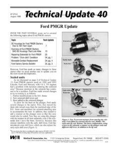 87-375-6 August 1998 Ford PMGR Update OVER THE PAST SEVERAL years, we’ve covered the following topics about Ford PMGR starters: DE Housings for Ford PMGR Starters: How to Tell Them Apart Overview of Ford PMGR Starters SHO DE Housings That Look Alike 13 Repairing Solenoids for Ford PMGR = 25 Problem: “Click-click” Condition 34, pg. 1 Moveable Contact Replacement 34, pg. 4 Ford Factory Service Bulletin 35, pg. 3 Topic Tech Update However, Ford has made so many changes to these starters that we need another one to update you on the most recent developments. Sealed units As we discussed on page 2 of Technical Update 13, Ford PMGR starters used on 1992 and 1993 Lincoln, Ford and Mercury with 4.6 L V8 engines had a problem with moisture entering the solenoid area.* Because moisture in the solenoid has contin- ued to be a problem, Ford has made several changes to try to remedy it, as follows: 1. Further modifications to the D.E. frame 2. New solenoid shift-lever seal 3. Boot added to the solenoid plunger. To allow for the boot on the plunger, Ford made several changes to the starter. First, they moved the drain tube inward away from the machined edge of the D.E. frame and machined the solenoid-attaching area to accommodate the boot. In addition, they needed to add a retainer on the plunger stem so that this area would also be sealed. Now they are using this plunger with the retainer in all their solenoids, even if the sole- noids don’t have the boot. However, because this retainer interferes with the early shift lever, Ford has introduced a new shift lever, which can also replace the early-style shift lever (Figure /). *We now know that this is a problem for other starters (WAIR 2-1567-FD and 2-1799-FD) covering many OE numbers and many applications. ce External seal Early-style Drain tube Lip seal yd easy <— Machined for solenoid boot Late-style Drain tube Retainer on plunger stem Lip seal Shift lever Solenoid boot Figure 1. Top: To prevent moisture from entering the sole- noid, Ford added an external silicone seal. Middle: The early-style lip seal. Bottom: The latest configuration, using a boot on the solenoid, a retainer on the plunger stem and different shift lever, in addition to the lip seal. y fai | Wetherill Associates, Inc. 1101 Enterprise Drive Royersford, PA 19468 800-877-3340 Care is taken to ensure the accuracy of information presented here, but Wetherill Associates, Inc., assumes no responsibility for possible errors. Copyright © 1998 Wetherill Associates, Inc. 6236 Technical Update 40 page 2 . Spade M6 x 1.0 S-terminal Early Late S-terminal on left on right Figure 2. Left: Early solenoid with spade S-terminal and early brush holder. Right: Later solenoid with M6 x 1.0 S-terminal and late-style brush holder. Note change in position of flag on brush holder leads. Solenoid and brush holder Ford PMGR starters initially used a solenoid with a spade-type S-terminal. This spade terminal was on the left side of the solenoid, with the motor terminal at the bottom. This configuration allowed the motor lead on the brush holder to bolt onto the solenoid’s motor terminal without interfering with the S-terminal (Figure 2). Then in 1995 Ford introduced a number of starters that use a solenoid with an M6 x 1.0 S-termi- nal located on the right side. This design is used on applications that have the vehicle wiring coming in on that side. However, because of the position of this S-terminal, Ford also had to put a different flag on the brush holder’s motor lead, so the lead could bolt on without interfering with the S-terminal. In Figure 2, note where the flag is attached to the motor lead. This brush holder, using the late-design motor-lead configuration, can replace the early-style brush hold- er, as well. Solution to spade-terminal corrosion Sometime after they introduced the solenoid with the M6 x 1.0 S-terminal on the right, Ford began using another solenoid with an M6 x 1.0 S-terminal — this time on the left. By then they had realized that the spade-type S-terminal was having a problem with corrosion, and since then, all the starters we have purchased from Motorcraft use a solenoid with an M6 x 1.0 S-terminal, instead of a spade terminal. Figure 3. Ford con- version kit is on the left. WAL kit is on the right. Because of this tendency for the spade-type S-termi- nal to corrode, Ford developed a terminal-conversion kit that they provide with retrofit units. This kit allows the installer to convert the wiring of the vehi- cle from a spade-type to an eyelet-type S-terminal. The part number for the kit is WT-5673-B or F6VY- 14A411-AA (Figure 3). WAI also offers a conversion kit (79-2503), which gives the installer two options: They can con- vert the wiring on these units to the stud-type termi- nal or bolt on an angle male-spade terminal to the M6 x1.0 S-terminal, and use the original female spade connector. However, in our opinion, if the installer continues to use the spade connector, rebuilders will see a higher rate of returns (Figure 3). Be careful of drives that look alike The most popular drive for Ford PMGR starters has 10 teeth, a white plastic ring and a gear OD of 28mm (54-212). But be careful! The 1995-1997 Contours and Mystiques with a 4-cylinder, 2 L engine also use a 10-tooth drive (54-216) -- but the gear OD on this drive is only 27mm and the plastic ring is pink. If the wrong drive is installed, this one- millimeter difference will cause the starter to either be very noisy or to not crank at all (Figure 4). Figure 4. 10-tooth drive on the left, with white plastic ring, is not interchangeable with 10-tooth drive on the right, with pink plastic ring. You may already know that starter drives for Ford PMGR were originally produced by Mitsubishi. However, Ford then took the operation in-house and now produces all these drives themselves. Listed below are the drives produced by Ford to date. These drives look slightly different from the Mitsubishi drives, but are funct