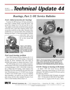 87-397-2 September 1999 Bearings, Part 2: OE Service Bulletins Ford: Added protection for bearings To protect the DE bearing in 3G Series alternators, Ford made a running change in the DE frames, and carried this change over to the 4G and 6G as well. They added a raised collar around the bearing opening in the DE frame, which then required a pulley with a cut-out that would fit over this collar. The point of this modification is to prevent debris from attacking the bearing seal (Figure /). Note that the pulleys from the early-style units were not cut out and will not fit on the revised DE frame. Figure 1. Ford added a raised collar on the D.E. frame of 3G series alter- nators to protect the bear- ing. The pulley was modi- fied to accommodate the collar. Ford truck bearing problem Ford TSB (Technical Service Bulletin) #95-17-13 covers a concern with the DE bearing in Motorcraft 95-amp 3G Series alternators that were used on FD1060/1460 engines in vehicles built before 7/3/95. This DE bearing seems to be wearing out prema- turely because of the force of the main drive-belt load. A revised alternator 1-1997-11FD (F5PZ-10346-GA) has a 24mm-wide DE bearing, which improves the handling of the force produced by the main drive-belt load. This alternator uses a 21-225 DE Frame, bearing 10-3032-4 and 24-2265 pulley. If you are building these alternators, you need to use all three of these parts along with the other standard 3G parts if you want to avoid warranty returns (Figure 2). Figure 2. To prevent premature bearing failure in 3G alter- nators used on medium and heavy trucks, Ford started using a 24mm-wide bearing. DE frame and pulley were modified to accommodate the bearing. All three must be used together when rebuilding these particular alternators. CS130: Change to bearing & DE frame In March 1994 GM issued Service Bulletin #366402, concerning improvements to CS130 series alternators. The bulletin covered CS130 units used on the following vehicles: 1990 – 94 Chevrolet & GMC P3 Models, all engines 1992 – 93 Chevrolet & GMC M/L/G Vans & S/T trucks with 4.3L engines (VIN’s W and Z – RPOs yj Wil Wetherill Associates, Inc. * 1101 Enterprise Drive * Royersford, PA 19468 +* 800-877-3340 Care is taken to ensure the accuracy of information presented here, but Wetherill Associates, Inc., assumes no responsibility for possible errors. Copyright © 1999 Wetherill Associates, Inc. 6475 Technical Update 44 page 2 L35 and LB4) 1992 – 94 Chevrolet & GMC C/K, all engines 1992 – 93 Oldsmobile Bravada According to this bulletin, beginning in 1994, all CS130 alternators used in the applications noted above would be produced with a larger 6303 DE bearing plus a steel cooling fan on the rotor. In addition, all new CS130 service units intended for use on the 1992-93 vehicles on this list would be produced with 6303 bear- ings, and all of GM’s remanufactured units for these vehicles would also be built to the 1994 specifications using the larger bearing. As a result of this change, DE frames for these CS130 units also had to be changed to accommodate the larger bearing. See Table I below for a complete list of superses- sions in the service units and the corresponding DE frames. Also see the conversion chart on page 3 for further clarification on changes to these DE frames. continued on page 4 Table 1.CS130 Unit and DE frame supersessions to accommodate 6303 bearing Units w/ 6203 bearings superseded to Units w/ 6303 bearings DE DE OE Service WAIR # Frame OE Service WAIR # Frame Unit # Unit # 6203 Unit # Unit # 6303 1101111 | 10463002 | 1-1629-34DR | 21-124 10480086 | 10463417 | 1-1766-33DR | 21-146 1101293 | 10463110 | 1-1629-21DR | 21-124 10480094 | 10463424 | 1-1766-22DR | 21-146 1101318 | 10463111 | 1-1629-21DR | 21-124 10480084 | 10463415 | 1-1766-22DR | 21-146 1101346 | 10463049 | 1-1250-34DR | 21-123 None 10463621 | None 21-145 1101500 | 10463146 | 1-1629-11DR | 21-124 10480082 | 10463413 | 1-1766-12DR | 21-146 1101571 | 10463140 | 1-1652-31DR | 21-118 10480088 | 10463419 | 1-1903-31DR | 21-149 1101617 | 10463146 | 1-1629-11DR | 21-124 10480082 | 10463413 | 1-1766-12DR | 21-146 1101618 | 10463049 | 1-1625-34DR | 21-123 None 10463621 | None 21-145 1101619 | 10463105 | 1-1640-11DR | 21-118 None 10463414 | None 21-149 1101620 | 10463111 | 1-1629-21DR | 21-124 10480084 | 10463415 | 1-1766-22DR | 21-146 1101621 | 10463039 | 1-1640-11DR | 21-118 10480085 | 10463416 | 1-1895-11DR | 21-149 1101629 | 10463110 | 1-1629-21DR | 21-124 10480094 | 10463424 | 1-1766-22DR | 21-146 1101633 | 10463002 | 1-1629-34DR | 21-124 10480086 | 10463417 | 1-1766-33DR | 21-146 1101635 | 10463159 | 1-1640-35DR | 21-118 10480092 | 10463423 | 1-1895-13DR | 21-149 1101636 | 10463180 | 1-1640-35DR | 21-118 10480092 | 10463423 | 1-1895-13DR | 21-149 1101637 | 10463445 | 1-1629-11DR | 21-124 10480087 | 10463418 | 1-1766-12DR | 21-146 1101806 | 10463183 | 1-1652-32DR | 21-118 None 10463420 | None 21-149 1101807 | 10463048 | 1-1640-32DR | 21-118 10480090 | 10463421 | 1-1895-32DR | 21-149 1102630 | 10463159 | 1-1640-35DR | 21-118 10480092 | 10463423 | 1-1895-13DR | 21-149 1102631 | 10463180 | 1-1640-35DR | 21-118 10480092 | 10463423 | 1-1895-13DR | 21-149 1105688 | 10463039 | 1-1640-11DR | 21-118 10480085 | 10463416 | 1-1895-11DR | 21-149 1105716 | 10463105 | 1-1640-11DR | 21-118 None 10463414 | None 21-149 1105720 | 10463048 | 1-1640-32DR | 21-118 10480090 | 10463421 | 1-1895-32DR | 21-149 1105722 | 10463049 | 1-1250-34DR | 21-123 None 10463621 | None 21-145 10479802 | 10463245 | 1-1622-21DR | 21-124 10480094 | 10463424 | 1-1766-22DR | 21-146 10479883 | 10463140 | 1-1640-31DR | 21-118 10480091 | 10463422 | 1-1895-31DR | 21-149 10479974 | 10463367 | 1-1625-12DR | 21-123 None 10463622 | None 21-145 10479997 | 10463368 | 1-1629-34DR | 21-124 10480099 | 10463425 1-1766-33DR | 21-146